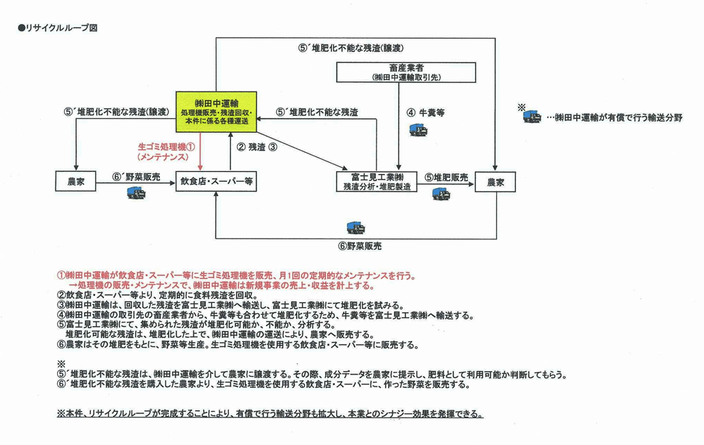 1.(株)田中運輸が飲食店・スーパー等に生ゴミ処理機を販売、月1回の定期的なメンテナンスを行う。
